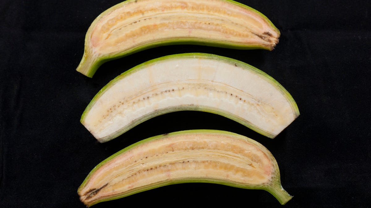 Only few of the Genetically Modified GM bananas have qualified for field studies and some are currently undergoing nutritional human trials. The little black dots running through the middle of the banana are the immature seeds. A genetically engineered GE or GMO banana would be.
